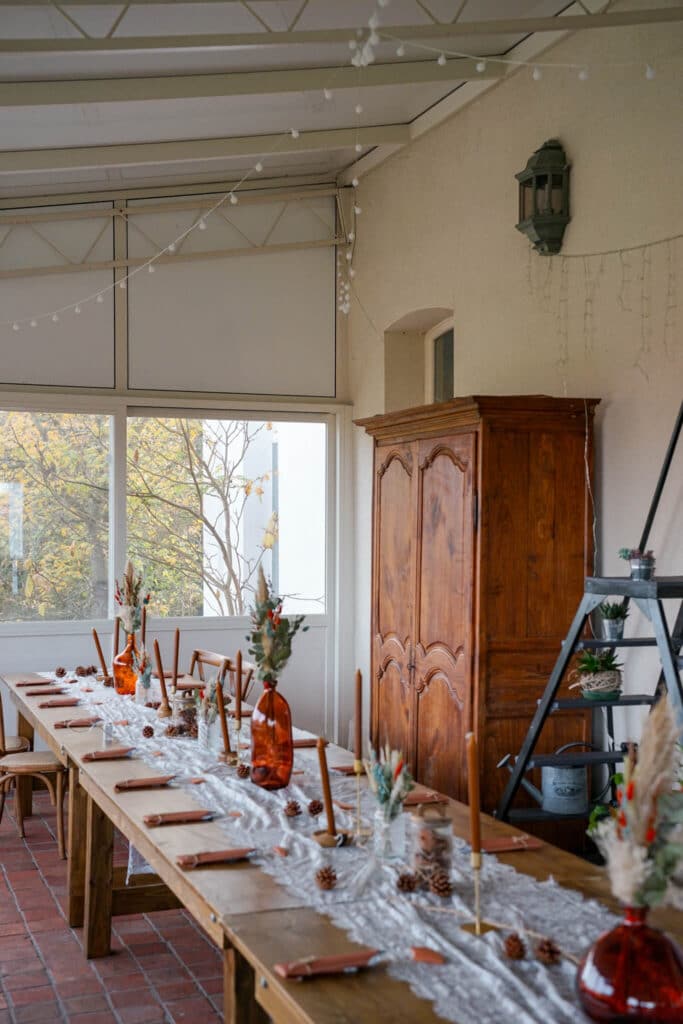 La véranda lumineuse apporte une touche plus ouverte et naturelle. Elle est idéale pour un cocktail, un brunch du lendemain ou un moment plus calme pendant la soirée.